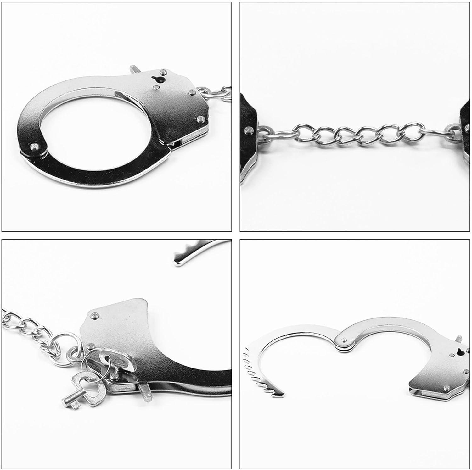 - Cơ chế khóa an toàn: Mỗi còng có thể mở và khóa dễ dàng. Bên trong còng có cơ chế chốt răng cưa, tương tự còng tay thật, giúp điều chỉnh độ chặt và đảm bảo an toàn khi sử dụng.