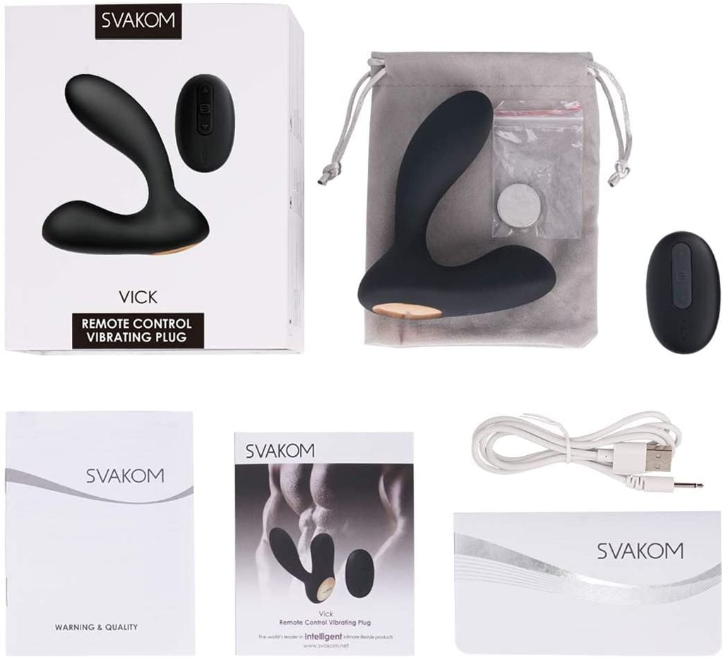 Bộ sản phẩm SVAKOM Vick bao gồm: Túi nhung cao cấp, dụng cụ hậu môn Vick, remote, cáp sạc USB, và phiếu hướng dẫn sử dụng.